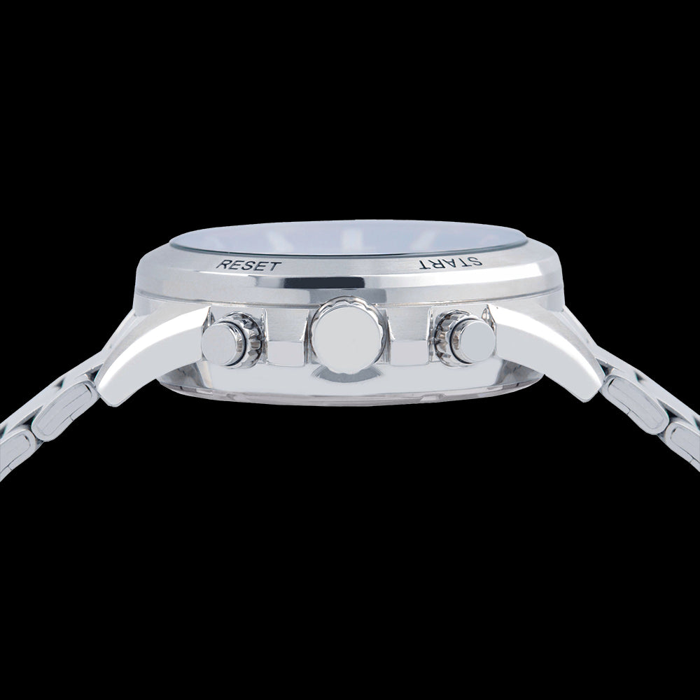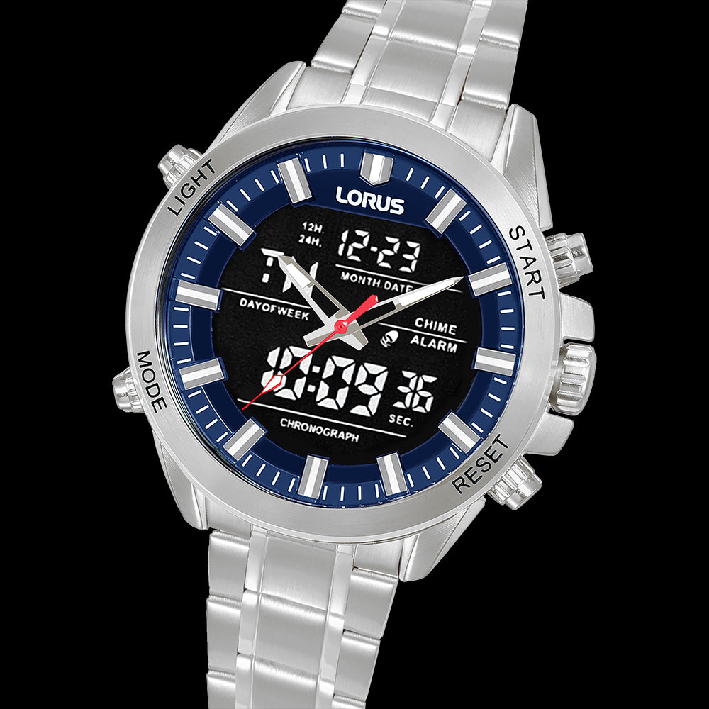 Mens 100m stainless steel blackand blue dial Lorus duo watch with alarm, stopwatch, count down timer, perpetual calendar and dual time